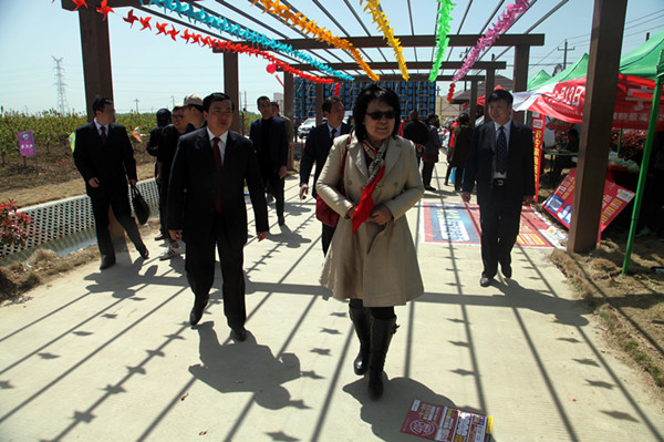 開園儀式期間,江蘇省國資委監(jiān)事會主席李海洋、江蘇農(nóng)墾集團(tuán)公司黨委委員、總會計師劉克英、盱眙縣委書記梁三元、盱眙縣人民政府副縣長鄭海梁在三河農(nóng)場有限公司黨委書記、董事長、總經(jīng)理王波成、黨委副書記、董事趙廣福、黨委委員、董事、副總經(jīng)理韓樹明的陪同下參觀了三河生態(tài)梨園。
