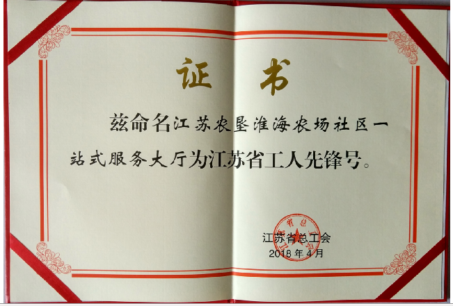 近日,省總工會授予江蘇農(nóng)墾淮海農(nóng)場社區(qū)一站式服務(wù)大廳獲江蘇省“工人先鋒號”榮譽稱號,這是淮海農(nóng)場社區(qū)首次獲此殊榮。