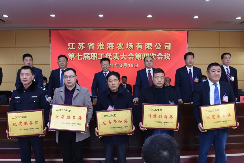 3月16日上午,在淮海農場有限公司召開的江蘇省淮海農場有限公司第七屆職工代表大會第四次會議上,淮海公司6名代表參加了農場公司召開的職代會活動,在先進單位表彰環(huán)節(jié),淮海有限公司再獲2020年度龍頭帶動獎,這是該公司在2014年在基地農場獲得品牌建設先進單位,2015年獲農場品牌貢獻獎,2016、2017、2018、2019年獲龍頭帶動獎后的又一殊榮。圖為公司總經理姜國平上臺與獲獎單位集體合影時的鏡頭。