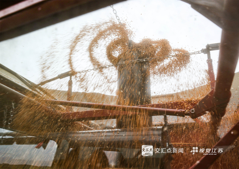 (特約攝影  許昌銀  錢厚紅  15:24攝  20:39上線)五月的麥田,金穗飄香。5月26日,淮安盱眙洪澤湖畔的江蘇農(nóng)墾三河農(nóng)場的3.82萬畝小麥開鐮收割。當(dāng)?shù)乩们绾锰鞖饧泳o收割,確保顆粒歸倉。