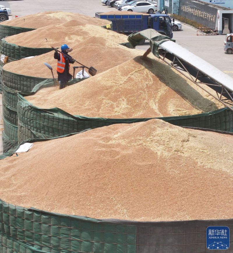 三河農(nóng)場(chǎng)收獲的小麥進(jìn)入大華種業(yè)三河分公司存儲(chǔ)(5月28日攝,無人機(jī)照片)。新華社發(fā)(許昌銀攝)