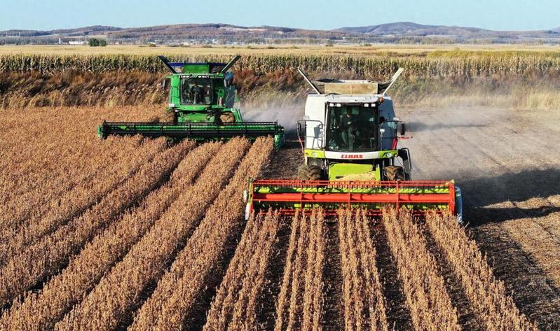 北大荒集團黑龍江八五六農場有限公司的農機在進行大豆收獲作業(yè)。(新華社發(fā) 王金彬 攝)