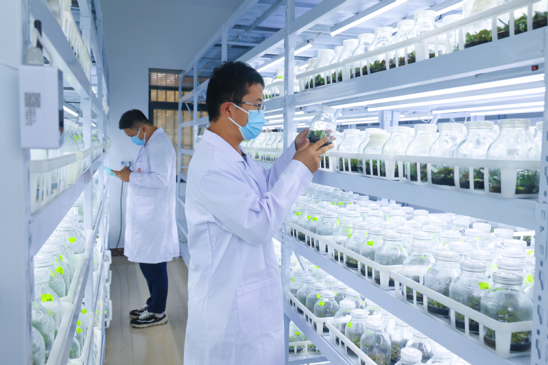 在江蘇農墾云臺農場的蝴蝶蘭培養(yǎng)室里,培養(yǎng)架上排列著一瓶瓶嫩綠的幼苗。通過精準調控光照波長、濕度梯度和營養(yǎng)配方,不僅可以縮短蝴蝶蘭育苗周期,還能顯著提高苗子的成活率和抗病性。圖為技術人員在開展日常蝴蝶蘭幼苗培育觀測工作,并同步系統(tǒng)記錄生長數(shù)據(jù)及環(huán)境調控參數(shù)。