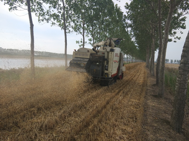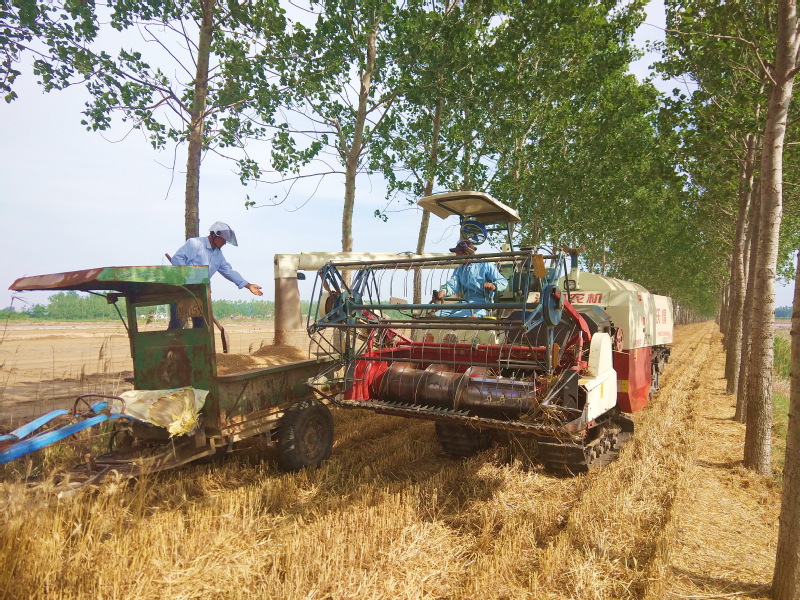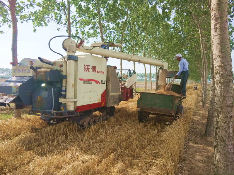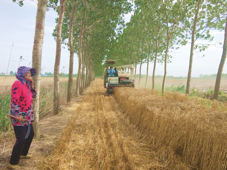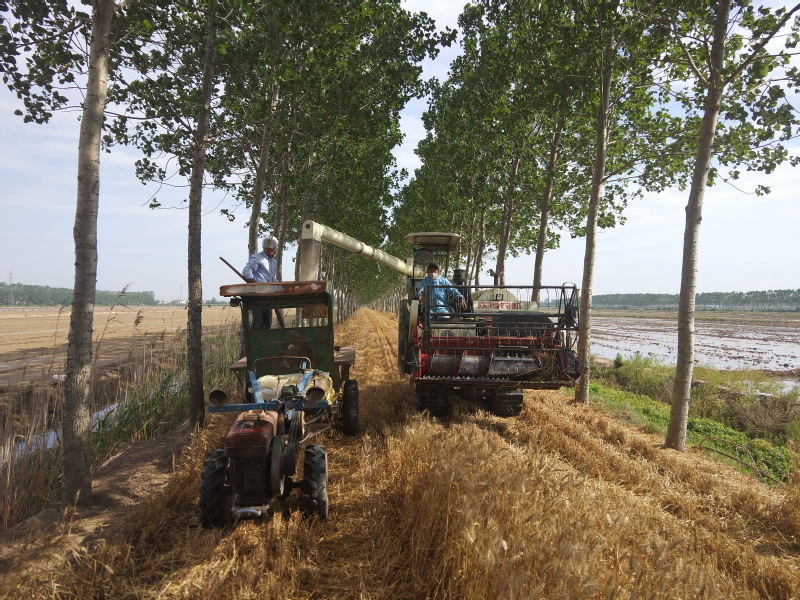 淮海農(nóng)場(chǎng)有限公司區(qū)域內(nèi)的林地資源十分豐富,農(nóng)場(chǎng)公司的境內(nèi)除路邊林、河邊林外,還有數(shù)千畝位于田頭的堆堤林和田間的防風(fēng)林,對(duì)于這些較為寬闊的林地,為便于務(wù)林職工在林地間以耕代扶,農(nóng)場(chǎng)公司的林業(yè)從業(yè)人員對(duì)這些林地進(jìn)行平整,并通過大規(guī)格樹木的規(guī)劃建設(shè),以方便機(jī)械化作業(yè),保證農(nóng)工在栽植好樹苗的同時(shí),林間還有充足的寬度保證耕耙播和小型收割機(jī)械進(jìn)行林間作業(yè),這一舉措在充分發(fā)揮林地的產(chǎn)能和效益的同時(shí),也大大減輕了林業(yè)從業(yè)人員的勞動(dòng)強(qiáng)度,讓人們從繁重的體力勞動(dòng)中解放出來(lái),從而大大提升了農(nóng)業(yè)職工務(wù)林的積極性,提升了種林的熱情,從而實(shí)現(xiàn)了農(nóng)場(chǎng)職工輕松種糧的夢(mèng)想。圖為淮海農(nóng)場(chǎng)有限公司五分場(chǎng)社區(qū)張為民承租的林下小麥成熟時(shí)的鏡頭。