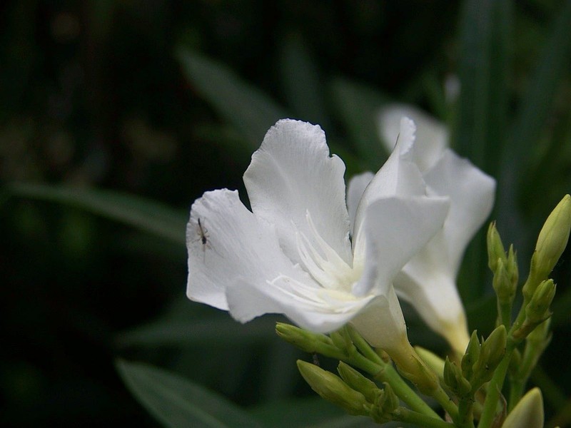 在農(nóng)場(chǎng)這里,夾竹桃的花有香氣,并且花集中生長(zhǎng)在枝條的頂端,如果你遠(yuǎn)看它們,它們聚集在一起的形態(tài)就好似一把浮在樹梢上似那張開的傘。你細(xì)瞧夾竹桃花,它的形狀像漏斗般,花瓣還是相互重疊,紅色的美、白色的純,看來(lái)別有一番洞天的感覺。