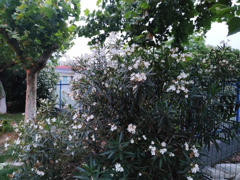 夾竹桃在淮海農(nóng)場(chǎng)健康路和農(nóng)場(chǎng)陳列館西側(cè)圍墻邊的一道風(fēng)景,目前正是夾竹桃開花的時(shí)節(jié),其葉片如柳似竹,或是紅花灼灼、或是白花燦燦,勝似桃花,在我們農(nóng)場(chǎng),其花冠粉紅至深紅、白色的花朵都能見到它的芳姿,并且其花還帶有特殊香氣,在農(nóng)場(chǎng)這個(gè)環(huán)境下的6-10月都能看到它開花。