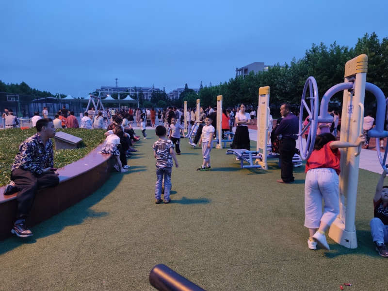 我們注意到,在農(nóng)場眾多的健身器材上,除因為安全原因,拆除的蕩秋千的筐籃外,這里還有孩子們喜愛的波浪橋、太空邁步器、橢圓跑步機、蹬腿器、大轉(zhuǎn)盤、小轉(zhuǎn)盤等,只要他們想玩,個子夠高、手夠長,他們都是要嘗試一下,在瘋玩中體會到了健身的快樂。在廣場上,他們除了玩轉(zhuǎn)健身器材外,在健身器材間、舞蹈池或是塑膠跑道上奔跑追逐又是他們常玩的活動之一,因為在這里玩耍,可以找到許多志同道合的玩友,大家聚在一起交流,可以在快樂中度過愉快的一天,并且在柵欄框圍的廣場內(nèi)運動,不會有像路上過往的車輛安全之憂,也可以讓陪著孩子的家長們,也有時間在廣場內(nèi)進行適當?shù)倪\動或是同孩子們一起互動,可謂在一舉多得中增進與孩子們的感情。