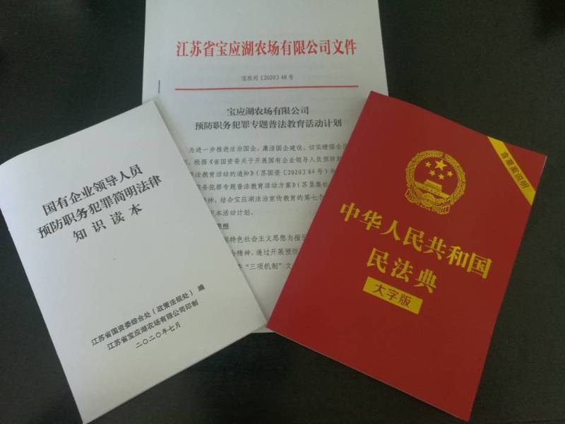(圖為寶應湖農(nóng)場有限公司制定計劃文件,印制知識讀本和《民法典》)