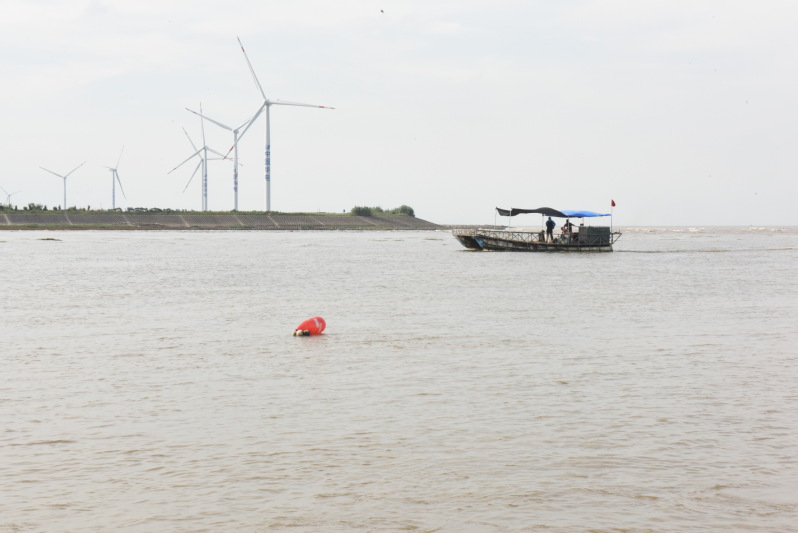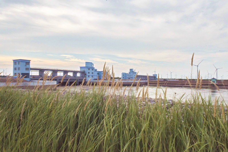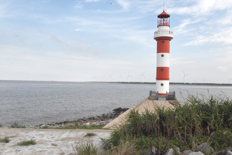 后因蘇北灌溉總渠的竣工和??陂l的先后興建,才改變了過去扁擔(dān)港的模樣。在南側(cè)的蘇北灌溉總渠六垛閘向海邊延伸的河道上,雖經(jīng)多次清淤,但幾公里長的河道上的治理效果并不好,始終出現(xiàn)在人們面前的是蜿蜒淺流的水道;而在北側(cè)海邊修建的則是非常壯觀的海口閘,內(nèi)側(cè)是清徹平靜的河水,外側(cè)則是黃濁翻滾的海浪,如果此時開閘,兩種水在不斷碰撞中融合在了一起,那些隨河水而下的魚類則難以忍受這種環(huán)境,在不斷的顛簸中流入海中或是成為人們的美食。那些海邊的燈塔、一字排開的擋浪水泥桿、搖曳的大風(fēng)車和深入到海水中的亭臺,無不成了觀賞風(fēng)景中的唯美角色。