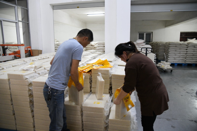 隨著人們生活水平的提高和對品質(zhì)生活的需求,如今在淮海公司生產(chǎn)的小包裝真空渠星大米,越來越受到廣大城鄉(xiāng)消費(fèi)者的厚愛,公司的小包裝真空大米的銷售也步入了快車道。我們在現(xiàn)場看到,在淮海公司的小包裝生產(chǎn)車間,不僅真空包裝的機(jī)器生產(chǎn)不停,員工們在堆得整整齊齊的真空大米包裝袋間,進(jìn)行著緊張而又有序地套袋、封裝、裝箱流程作業(yè),由于這些小包裝真空大米中,通過科技創(chuàng)新,在水稻生長環(huán)節(jié)添加了富硒鋅元素,這些元素不僅增添了口感的體驗(yàn),更是注重對人們飲食健康和保養(yǎng)滋潤的功效,因而這些大米已經(jīng)成為高檔消費(fèi)者的首選,成為人們禮尚往來的饋贈品牌。圖為淮海公司員工正在包裝真空大米時(shí)的鏡頭。