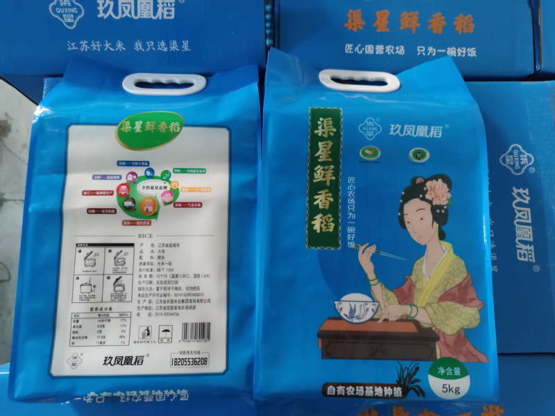 這款凈含量為5公斤,以“匠心農(nóng)場只為一碗好飯”的廣告語和“自有農(nóng)場基地種植”的文字和古代淑女手持筷子,整碗大米飯的圖案,就已經(jīng)夠吸引人們的關(guān)注了。更何況反面印制的渠星鮮香稻有機(jī)綠色標(biāo)準(zhǔn)種植、工廠化育秧、生態(tài)農(nóng)場基地、現(xiàn)代營銷銷售、安全快捷運(yùn)輸、標(biāo)準(zhǔn)化生產(chǎn)加工、低溫保鮮倉儲、全程不落地收割等全程質(zhì)量追溯體系的建設(shè)圖譜,讓淮海公司生產(chǎn)的粳一級大米的外在形象凸顯,極大地提升了渠星牌系列大米的品牌宣傳,也讓淮海公司眾多渠星牌商標(biāo)下又多了一個子品牌,擴(kuò)大了市場的影響力和美譽(yù)度。圖為包裝袋上印制的渠星鮮香稻圖案及商標(biāo)。