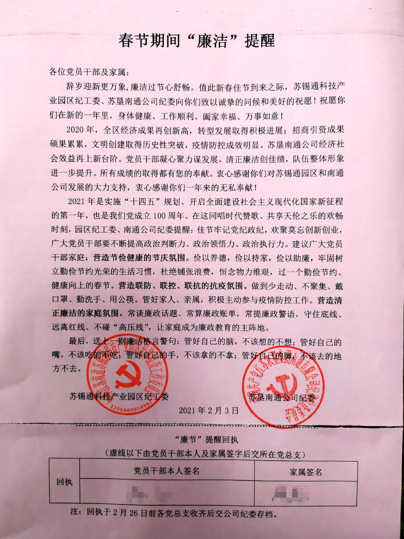 在新春佳節(jié)來臨之際,蘇墾南通公司紀委借助“墾地廉潔共建”平臺,聯(lián)合蘇錫通園區(qū)紀工委,創(chuàng)新新廉潔教育載體,聯(lián)合向公司86名干部職工及家屬寄出一封“春節(jié)廉潔提醒信”,向大家致以節(jié)日的問候和祝福,并對節(jié)日期間的廉潔紀律提出要求:一是營造節(jié)儉健康的節(jié)慶氛圍;二是營造聯(lián)防聯(lián)控、聯(lián)抗的抗疫氛圍;三是營造清正廉潔的家庭氛圍。