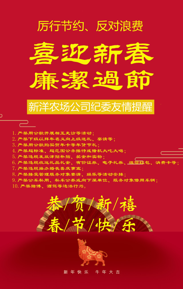 “春節(jié)既是歡樂喜慶的日子,同時也是違紀(jì)違規(guī)的高危期,希望廣大黨員干部戒奢以儉、廉潔過節(jié)、文明過節(jié)!”春節(jié)前,新洋農(nóng)場有限公司紀(jì)委發(fā)出節(jié)前廉潔過節(jié)提醒函,要求各級黨組織及主要負(fù)責(zé)人切實履行全面從嚴(yán)治黨主體責(zé)任和第一責(zé)任人責(zé)任,加強黨員教育和監(jiān)督管理,組織黨員干部深入學(xué)習(xí)貫徹落實中央八項規(guī)定精神,堅持不懈糾治“四風(fēng)”,不斷鞏固拓展作風(fēng)建設(shè)成果,推動中央八項規(guī)定精神落地生根。