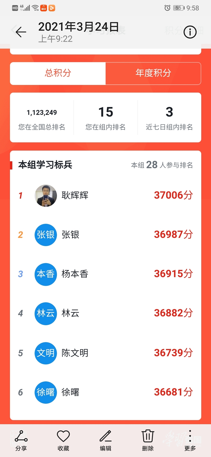 會(huì)議公布了當(dāng)前支部排名前五的人員,分別是耿輝輝、張銀、楊本香、林云和陳文明,總積分均在36700分以上,特別是耿輝輝,總積分達(dá)到了37006分,為本支部學(xué)習(xí)標(biāo)兵。