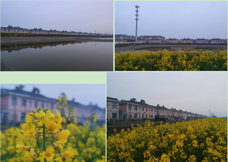 雖然農(nóng)場(chǎng)小城鎮(zhèn)建設(shè)的擴(kuò)充,公共綠化設(shè)施的到位和景觀長(zhǎng)廊的配置,讓過(guò)去場(chǎng)部大片大片的油菜花現(xiàn)在已經(jīng)難得再見(jiàn),但我們從一些老舊小區(qū)內(nèi)家前屋后栽種的部分油菜花中,還是看到了油菜即將盛開(kāi)開(kāi)放的鏡頭。于是,利用傍晚散步的機(jī)會(huì),特意來(lái)到蘇北灌溉總渠邊上遙望,果然呈現(xiàn)帶狀的油菜花已經(jīng)盛開(kāi),并將農(nóng)場(chǎng)別墅沿線裝點(diǎn)的非常美麗。