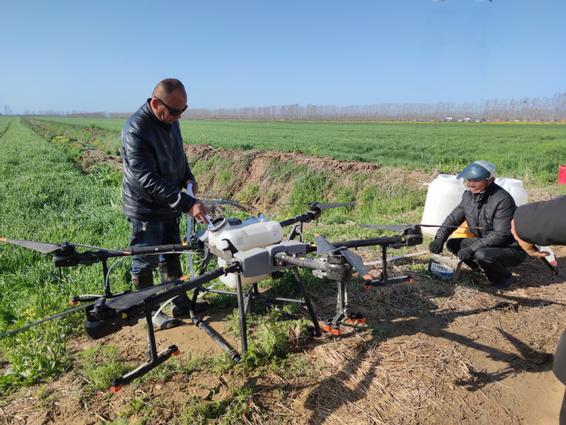 據(jù)介紹,這架植保無人機(jī)一次可裝載10公升藥水,飛行一次可完成10畝小麥田的噴灑作業(yè)任務(wù),2000余畝小麥田藥劑噴灑作業(yè)預(yù)計(jì)可以在五天左右完成。“有植保無人機(jī)替代機(jī)械下田噴藥,克服了許多田間不便作業(yè)的制約因素,對(duì)于我們管理者來說,現(xiàn)在我們種田更加輕松了。”四十大隊(duì)大隊(duì)長孫海明表示。
