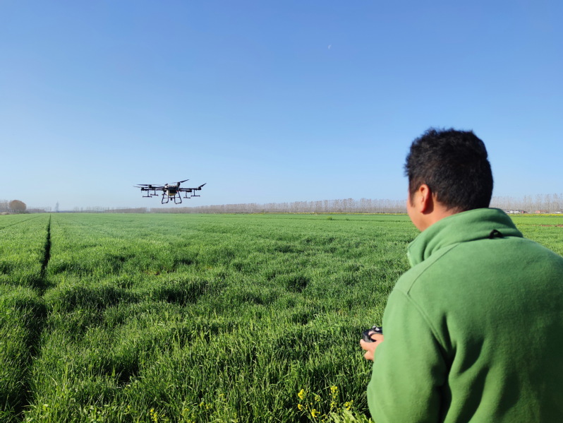 我們注意到,伴隨著螺旋槳的轟鳴聲,攜帶著化調(diào)藥液的植保無人機(jī)在離地面約兩米多的空中勻速飛行,五個(gè)螺旋槳下的噴桿均勻地向下噴灑著霧狀藥液,隨即灑落在地面的麥葉上。一位操縱著遙控器的飛防人員,一會(huì)兒盯著屏幕察看著數(shù)據(jù),一會(huì)兒向田間遙望著無人機(jī)的蹤跡。