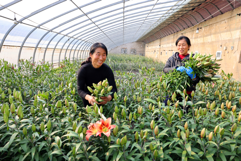 12月5日,崗埠農(nóng)場富民科技園溫室內(nèi),一株株綠意蔥翠的百合含苞待放,花農(nóng)正在忙著采摘百合銷售,百合每扎(10支) 田頭批發(fā)價50元左右,花農(nóng)樂得合不攏嘴。