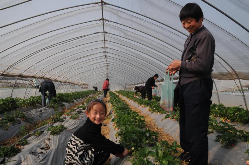 三河農(nóng)場種植草莓已有二十多年歷史,從最初的幾戶發(fā)展目前的幾十戶,最多的種植戶一家種植近二十個大棚,草莓讓他們的生活發(fā)生了翻天覆地的變化。高開蘭是三河第一批草莓種植戶,二十多年來,她不僅積累了豐富的種植和管理經(jīng)驗,在銷售上也有自己的竅門,雖然每天與泥土打交道,大忙時一整天都呆在大棚里,可是她卻樂在其中,她告訴我們,如今孩子大,在盱眙縣城也買了房子,所有收入都來自她種植的大棚草莓。走進她的大棚里,不僅有草莓,在草莓間還套種了各種反季節(jié)蔬菜,套種模式不僅節(jié)約了空間而且增加了效益,一個大棚的收入由起初的5000-6000元增加至現(xiàn)在的8000一10000元。