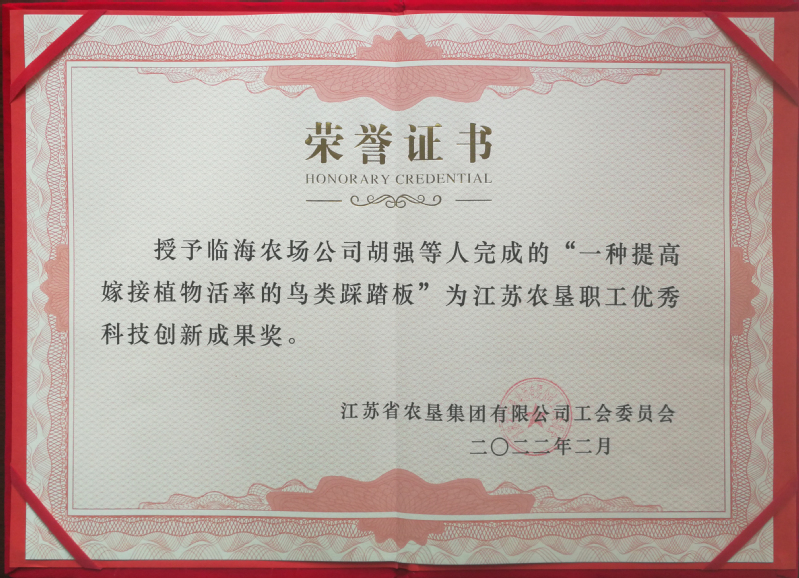 前不久,臨海胡強(qiáng)等人開展的“一種提高嫁接植物活率的鳥類踩踏板”林業(yè)職工實(shí)用型創(chuàng)新項(xiàng)目,榮獲江蘇農(nóng)墾職工優(yōu)秀創(chuàng)新成果獎(jiǎng),收到江蘇農(nóng)墾集團(tuán)公司工會(huì)授予的獲獎(jiǎng)證書。