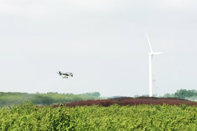 目前,正是蚜蟲、粘蟲等害蟲高發(fā)季節(jié),無人機空中作業(yè)具有不受地形限制,作業(yè)效率高、效果好的特點。農(nóng)藥自上向下噴灑,能夠直達樹梢,提高農(nóng)藥利用效率,很好解決了高大苗木噴灑難,噴不透的難題。