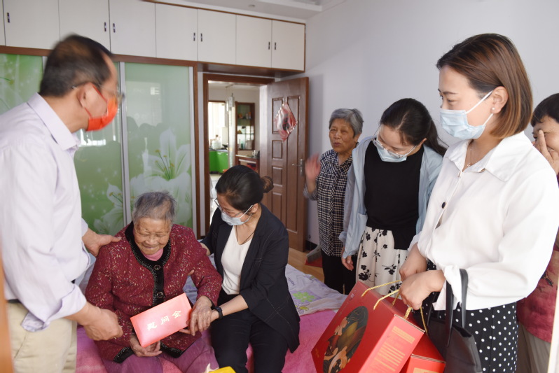 上午8點(diǎn),淮海農(nóng)場公司工會部門負(fù)責(zé)人、社區(qū)老齡委主任等一行來到五岸新村百歲老人邱鳳英老人家中。邱鳳英老人已經(jīng)101歲,當(dāng)大家走進(jìn)臥室的時候,老人衣著整潔,神清氣爽地端坐在沙發(fā)上,熱情地跟大家打招呼。慰問人員向老人子女詳細(xì)了解老人的身體狀況、日常飲食和起居等情況,并向老人遞上慰問金,祝愿老人家端午安康。隨同的老齡委主任則握住老人的手,高興地說:“再過幾天就是端午節(jié)了,祝您老人家身體健康幸福長壽?!碑?dāng)老人收到工作人員手中寫有“?!薄暗摗弊謽拥聂兆佣Y盒時,激動地說:“謝謝你們經(jīng)常來看望我,非常感謝!”