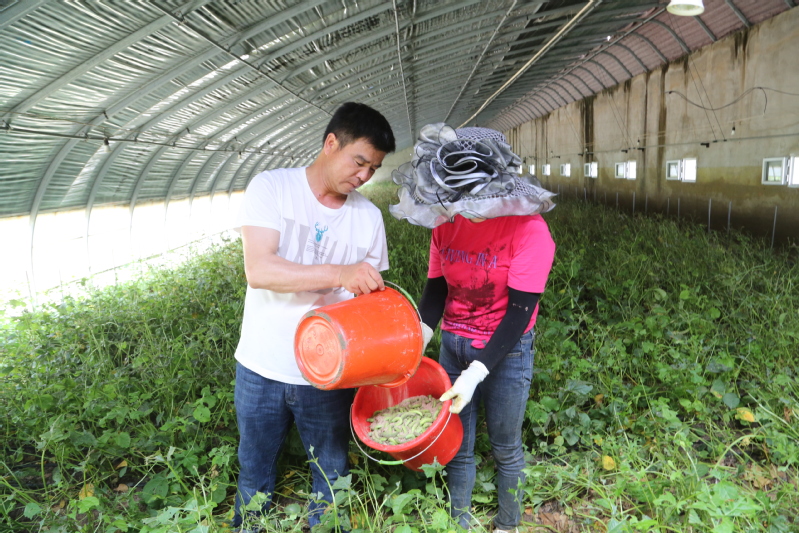 6月24日上午,在崗埠富民農(nóng)業(yè)科技園4號(hào)大棚內(nèi),肉滾滾、翠綠的豆丹隨處可見(jiàn),非常喜人,園區(qū)兩名工人正在豆苗地里捕捉豆丹。