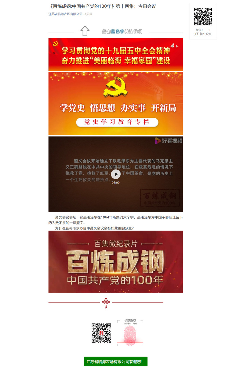 農(nóng)場(chǎng)公司微信公眾號(hào)上開(kāi)設(shè)“百個(gè)瞬間說(shuō)百年”“百煉成鋼”“中國(guó)精神”等欄目,以不同時(shí)期的典型事例、紅色故事、革命精神為主干,每周一至周五通過(guò)文字、圖片、視頻等方式推出系列報(bào)道,積極宣傳黨帶領(lǐng)人民不懈奮斗的光輝歷程,每周播出10期。各黨總支、支部深入貫徹黨史學(xué)習(xí)教育任務(wù)清單安排,在每次黨日主題活動(dòng)中,組織黨員干部宣講黨史,集中觀看微紀(jì)錄片《百煉成鋼》,深化中國(guó)共產(chǎn)黨為什么“能”、馬克思主義為什么“行”、中國(guó)特色社會(huì)主義為什么“好”等重大問(wèn)題的理解,通過(guò)聆聽(tīng)宣講,回顧歷史,大家紛紛表示在以后的工作中,發(fā)揮黨的光榮傳統(tǒng)和優(yōu)良作風(fēng),堅(jiān)定信念、凝聚力量;用黨的實(shí)踐創(chuàng)造和歷史經(jīng)驗(yàn)啟迪智慧、砥礪品格。