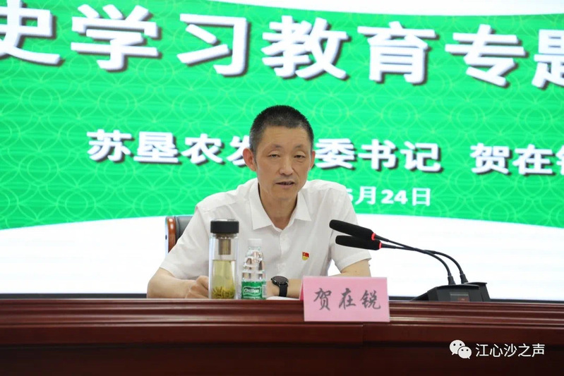 賀在銳分別從深入學(xué)習(xí)領(lǐng)會習(xí)近平總書記關(guān)于黨的歷史的重要論述,充分認(rèn)識開展黨史學(xué)習(xí)教育的重大意義;認(rèn)真研讀黨史基本著作,全面了解中國共產(chǎn)黨百年奮斗的光輝歷程和歷史性成就;深刻把握開展黨史學(xué)習(xí)教育的重點,扎實做好“六個進(jìn)一步”;開展黨史學(xué)習(xí)教育,要學(xué)懂弄通做實習(xí)近平新時代中國特色社會主義思想,增強“四個意識”,堅定“四個自信”,做到“兩個維護(hù)”等方面,對黨史學(xué)習(xí)教育的重要意義、重要方法、重點工作作了概述,解讀了中國共產(chǎn)黨的百年光輝歷程,并結(jié)合蘇墾農(nóng)發(fā)和江心沙發(fā)展實際探析了在當(dāng)前國際環(huán)境、國內(nèi)條件下的高質(zhì)量發(fā)展之路。