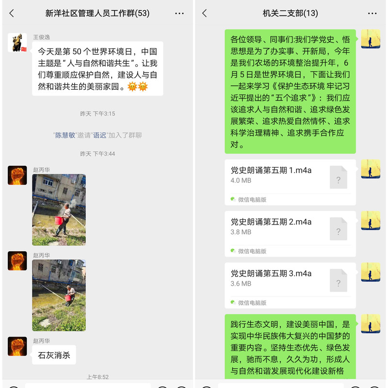 機關二支部則把黨史教育與環(huán)境整治相結合,通過支部黨史朗誦專題學習《保護生態(tài)環(huán)境牢記習近平提出的“五個追求”》,要求大家在農場公司黨委的領導下,追求人與自然和諧、追求綠色發(fā)展繁榮、追求熱愛自然情懷、追求科學治理精神、追求攜手合作應對,堅持生態(tài)優(yōu)先、綠色發(fā)展,馳而不息,久久為功,以更美的環(huán)境面貌慶祝建黨百年、迎接建場70周年。