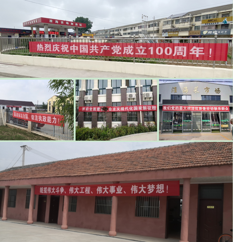 “七一”期間,無(wú)論是在淮海農(nóng)場(chǎng)場(chǎng)部小城鎮(zhèn),還是各分場(chǎng)社區(qū)或是二三產(chǎn)單位,我們?cè)?/span>這些單位,總會(huì)看到那一抹“中國(guó)紅”,這些黨史學(xué)習(xí)教育的文字橫幅,成為淮海農(nóng)場(chǎng)靚麗的風(fēng)景線(xiàn),振奮著人心,激勵(lì)著人們向前向前永向前。
